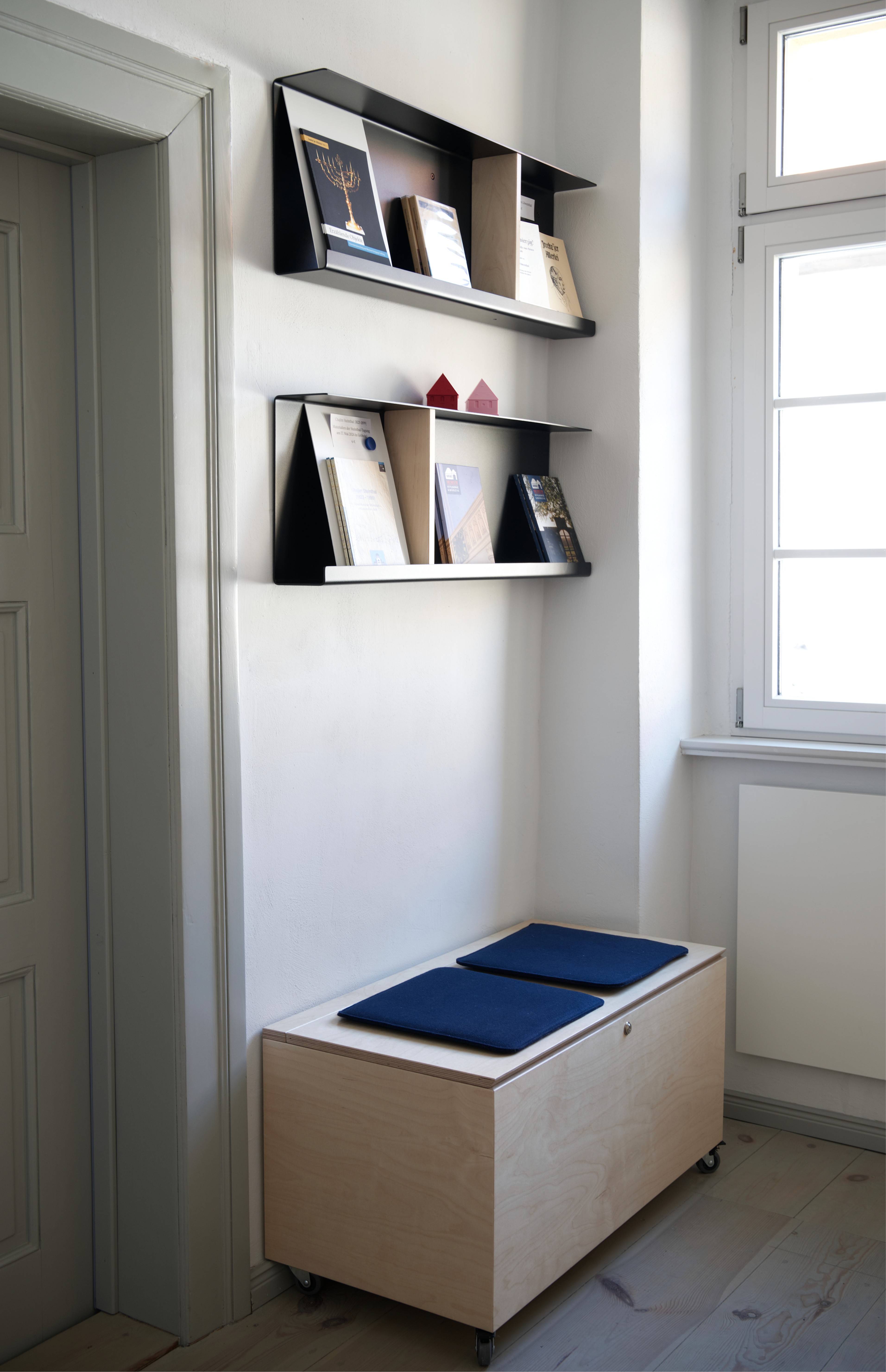 Museum Gröbzig, a small regional museum in Saxony-Anhalt, underwent a comprehensive redesign. The interior concept for the reception area – the first and last space visitors experience – focuses on functionality and clarity. A generous, barrier-free counter serves as both ticket desk and workspace. A custom shelving system displays shop items while providing storage for coats and bags. Materials were kept deliberately simple: birch plywood, powder-coated black steel, and vibrant orange accents. Project completed at Studio Hartensteiner